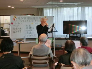 今回は、秋の曲がテーマ。短くて明るくて素朴で歌いやすい秋の曲を選曲くださいました。バイオリンやハーモニカの伴奏で、参加されたご入居者の皆さまは、まるで「ゆうらいふ合唱団」のようにしっかり歌われていました。