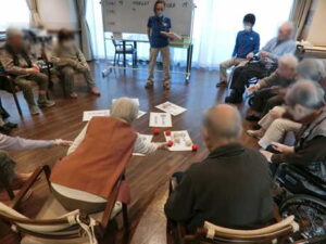 札を囲んで座っていただき、それぞれお持ちのお手玉を読み札が読まれたら同じお札の上にそっと?載せるかるた取りです。お札の上に載った紅白のお手玉の数を競い合います。