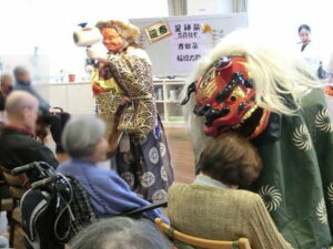 ゆうらいふ横浜のご入居者と職員のために、笛や太鼓のお囃子に合わせて獅子と大黒天様が舞い踊りました。