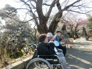 たくさんの梅が咲く境内で、ご入居者はスタッフが用意したお茶菓子を楽しみました。